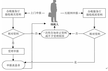 (1)办税服务厅接收纳税人资料或纳税人通过互联网络申报后提交的纸质资料,核对纳税人报送资料是否齐全、是否符合法定形式、填写内容是否完整,符合的即时办结;不符合的当场一次性告知纳税人应补正资料或不予受理原因。